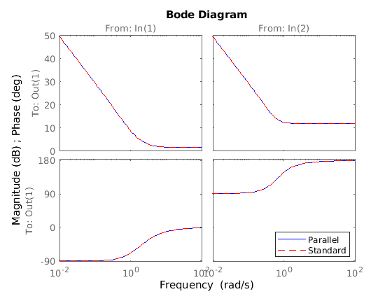 Чтобы создать или преобразовать в контроллер параллельной формы, использовать pid2. Параллельная форма описывает действия контроллера в терминах пропорционального, интеграла, и производная получает Kp, Ki и Kd и постоянную времени фильтра Tf. Например, отношением между входными параметрами и выходом параллельной формы непрерывного времени ПИД-регулятор 2-DOF дают: