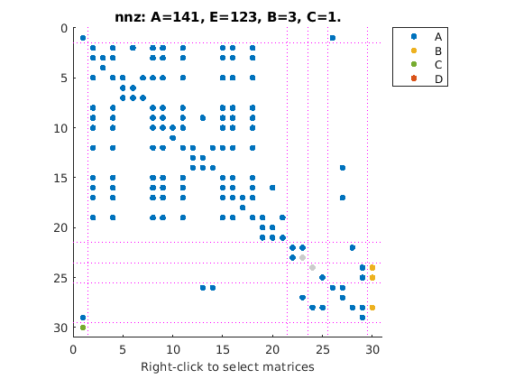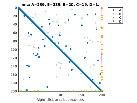 Здесь, xU и y представляйте состояния, вводы и выводы соответственно, в то время как ABCD и E матрицы пространства состояний. sparss объект представляет модель в пространстве состояний в MATLAB, хранящем разреженные матрицы ABCD и E наряду с другой информацией, такой как шаг расчета, имена и задерживается характерный для вводов и выводов.