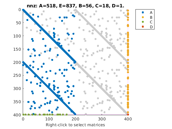 E разреженная большая матрица с тем же размером как матричный A. Когда E не использован, sparss заполняет E с единичной матрицей.