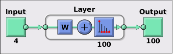 В этом рисунке каждый из шестиугольников представляет нейрон. Сетка 10 10, таким образом, существует в общей сложности 100 нейронов в этой сети. В каждом входном векторе существует четыре элемента, таким образом, входное пространство является четырехмерным. Векторы веса (кластерные центры) находятся в пределах этого пробела.