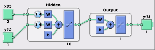 Создайте сеть. Сеть NARX, narxnet, сеть прямого распространения с коричнево-сигмоидальной передаточной функцией по умолчанию в скрытом слое и линейной передаточной функцией в выходном слое. Эта сеть имеет два входных параметров. Каждый - внешний вход, и другой связь обратной связи от сетевого выхода. (После того, как сеть была обучена, эта связь обратной связи может быть закрыта, как вы будете видеть на более позднем шаге.) Для каждых из этих входных параметров, существует коснувшаяся линия задержки, чтобы сохранить предыдущие значения. Чтобы присвоить сетевую архитектуру для сети NARX, необходимо выбрать задержки, сопоставленные с каждой коснувшейся линией задержки, и также количеством нейронов скрытого слоя. В следующих шагах вы присваиваете входные задержки и задержки обратной связи, чтобы лежать в диапазоне от 1 до 4 и количество скрытых нейронов, чтобы быть 10.