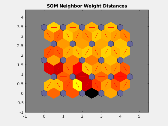 plotsomnd(net) строит SOM нейроны показывающего слоя как серо-синие закрашенные фигуры и их прямые соседние отношения с красными линиями. Соседние закрашенные фигуры окрашены от черного до желтого, чтобы показать, как близко вектор веса каждого нейрона его соседям.