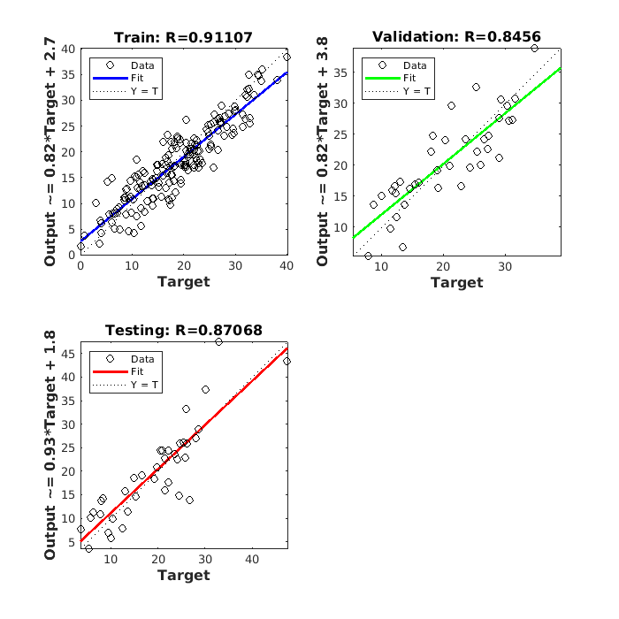 Figure Regression (plotregression) contains 3 axes. Axes 1 with title Train: R=0.91107 contains 3 objects of type line. These objects represent Y = T, Fit, Data. Axes 2 with title Validation: R=0.8456 contains 3 objects of type line. These objects represent Y = T, Fit, Data. Axes 3 with title Testing: R=0.87068 contains 3 objects of type line. These objects represent Y = T, Fit, Data.