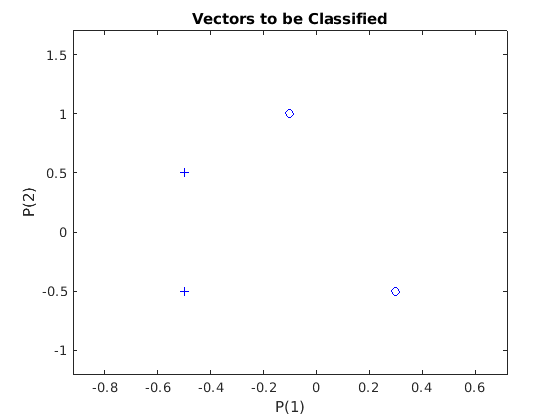Каждый из этих четырех вектор-столбцов в X задает, двухэлементные входные векторы и вектор-строка T задают целевые категории вектора. Мы можем построить эти векторы с PLOTPV.
