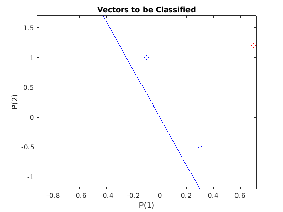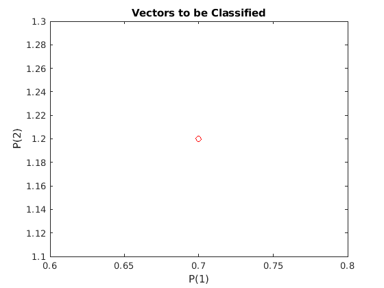 Теперь SIM используется, чтобы классифицировать любой другой входной вектор, как [0.7; 1.2]. График этой новой точки с исходным набором обучающих данных показывает, как сеть выполняет. Чтобы отличить его от набора обучающих данных, окрасьте его в красный.