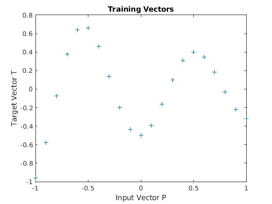 X = -1:.1:1; T = [-.9602 -.5770 -.0729 .3771 .6405 .6600 .4609 ... .1336 -.2013 -.4344 -.5000 -.3930 -.1647 .0988 ... .3072 .3960 .3449 .1816 -.0312 -.2189 -.3201]; plot(X,T,'+'); title('Training Vectors'); xlabel('Input Vector P'); ylabel('Target Vector T');