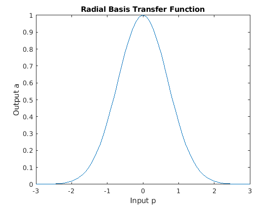x = -3:.1:3; a = radbas(x); plot(x,a) title('Radial Basis Transfer Function'); xlabel('Input p'); ylabel('Output a');