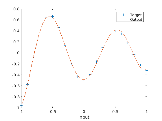 plot(X,T,'+'); xlabel('Input'); X = -1:.01:1; Y = net(X); hold on; plot(X,Y); hold off; legend({'Target','Output'})