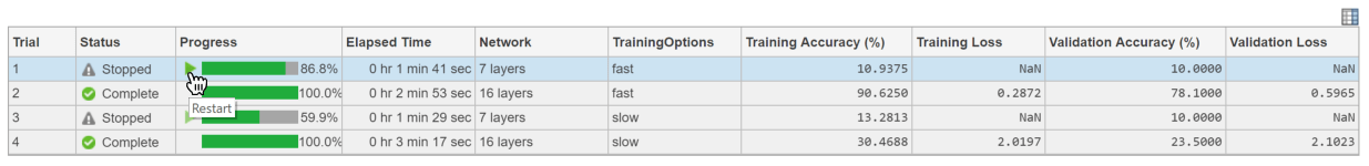 Продолжение обучения тем испытаниям не приводит ни к каким полезным результатам, таким образом, можно остановить те испытания, прежде чем обучение будет завершено. Experiment Manager продолжает обучение остающимся испытаниям.
