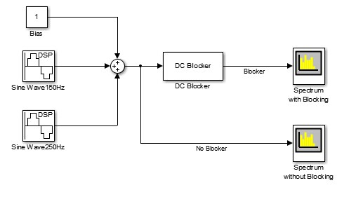 Этот блок реализует алгоритм, входные параметры и выходные параметры, описанные на dsp.DCBlocker страница с описанием. Свойства объектов соответствуют параметрам блоков.
