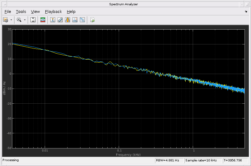 создает цветной шумовой объект, cn = dsp.ColoredNoisecn, это выводит шум, сигнализируют об одной выборке или структурируют за один раз, с 1 / | f |α спектральная характеристика по ее целому частотному диапазону. Типичными значениями для α является α = 1 (розовый шум) и α = 2 (броуновский шум).
