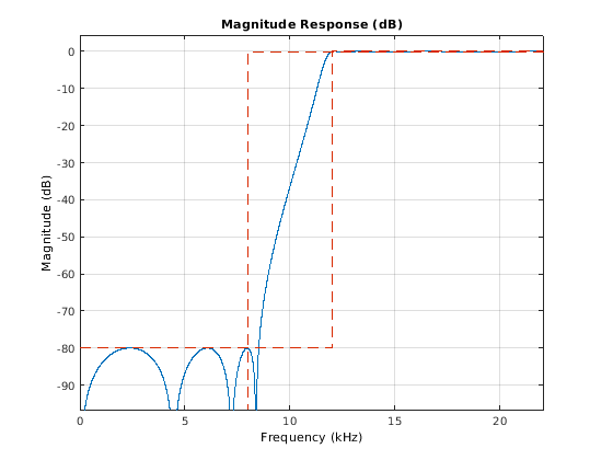 возвращает КИХ минимального порядка highpass фильтр, HPF = dsp.HighpassFilterHPF, с настройками фильтра по умолчанию. Вызов объекта с настройками свойства по умолчанию фильтрует входные данные с частотой полосы задерживания 8 kHz, частота полосы пропускания 12 kHz, затухание в полосе задерживания 80 дБ и неравномерность в полосе пропускания 0.1 дБ.