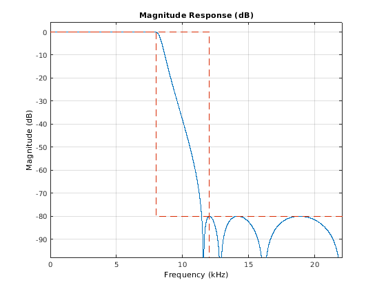Fs = 44.1e3; filtertype = 'FIR'; Fpass = 8e3; Fstop = 12e3; Rp = 0.1; Astop = 80; FIRLPF = dsp.LowpassFilter('SampleRate',Fs, ... 'FilterType',filtertype, ... 'PassbandFrequency',Fpass, ... 'StopbandFrequency',Fstop, ... 'PassbandRipple',Rp, ... 'StopbandAttenuation',Astop);