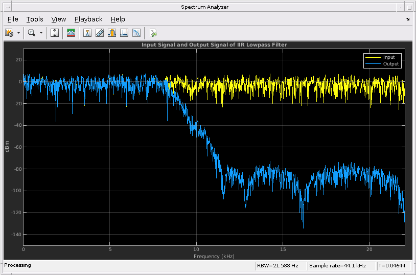 hSA = dsp.SpectrumAnalyzer('SampleRate',44.1e3,... 'PlotAsTwoSidedSpectrum',false,'ShowLegend',true,'YLimits',... [-150 30],... 'Title',... 'Input Signal and Output Signal of IIR Lowpass Filter'); hSA.ChannelNames = {'Input','Output'};
