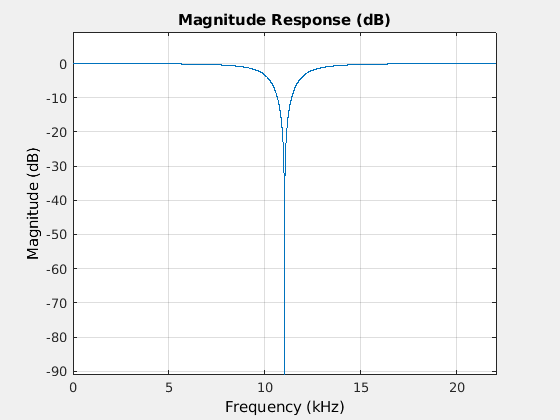 возвращает отметку второго порядка и худой БИХ-фильтр, который независимо фильтрует каждый канал входа в зависимости от времени, с помощью заданной центральной частоты и пропускной способности на 3 дБ.npFilter = dsp.NotchPeakFilter