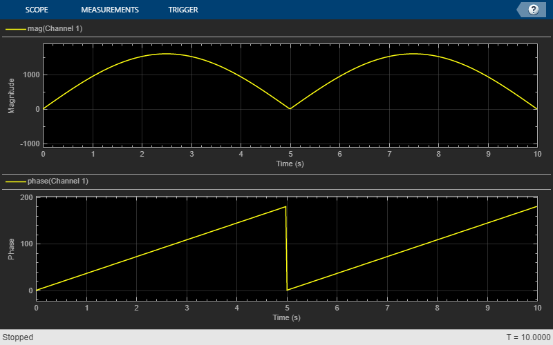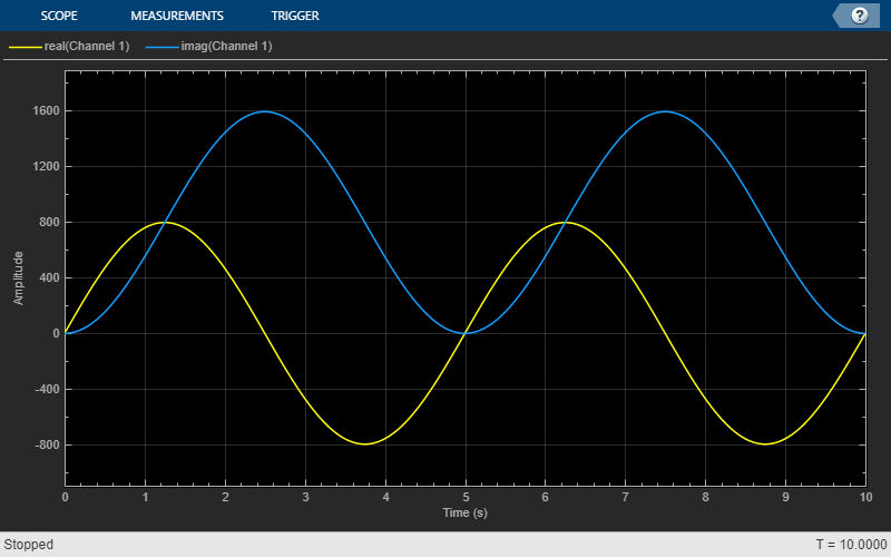 fs = 1000; t = (0:1/fs:10)'; CxSine = cos(2*pi*0.2*t) + 1i*sin(2*pi*0.2*t); CxSineSum = cumsum(CxSine); scope = timescope(1,fs,'TimeSpanSource','Auto','ShowLegend',1); scope(CxSineSum); release(scope)