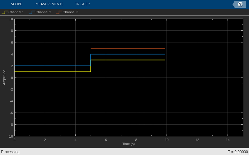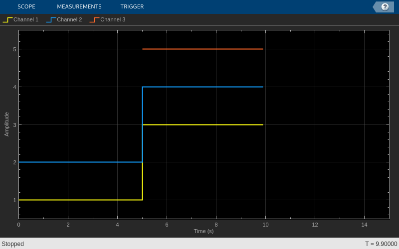 В этом примере размере входного сигнала к изменениям Time Scope, когда прогрессирует симуляция. Когда время симуляции меньше 5 секунд, Time Scope строит только двухканальный сигнал, sigdim2. После 5 секунд Time Scope также строит сигнал с тремя каналами, sigdim3.