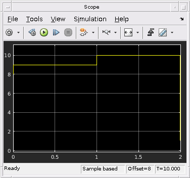 Откройте модель и запустите симуляцию, чтобы видеть исходный выход scope. Симуляция запускается для 10 временных шагов, подходящих 1 на каждом временном шаге.