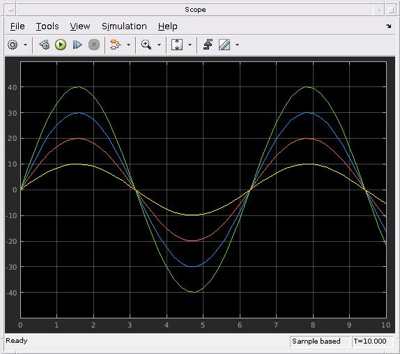 В этой простой модели блок Sine Wave соединяется с блоком scope. Блок Sine Wave выходные параметры четыре сигнала с амплитудами [10, 20; 30 40]. Осциллограф отображает каждую синусоиду в массиве отдельно в матричном порядке (1,1), (2,1), (1,2), (2,2).