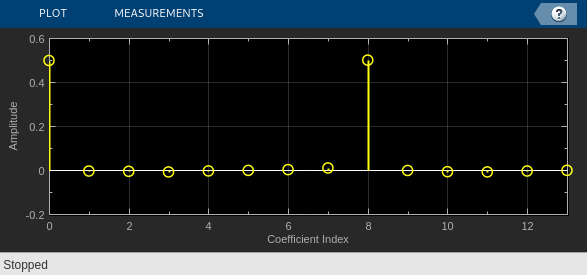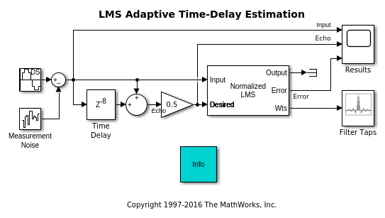 В этом примере показано, как адаптивно оценить задержку шумного входного сигнала с помощью адаптивного КИХ-алгоритма LMS. Пик в векторе касаний фильтра указывает на оценку с временной задержкой.