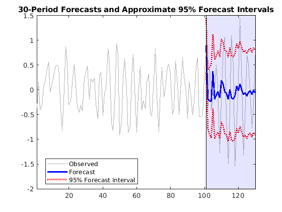 [yF,yMSE] = forecast(EstMdl,30,'Y0',y(1:100),... 'X0',X(1:100,:),'XF',X(101:end,:)); figure plot(y,'Color',[.7,.7,.7]); hold on plot(101:130,yF,'b','LineWidth',2); plot(101:130,yF+1.96*sqrt(yMSE),'r:',... 'LineWidth',2); plot(101:130,yF-1.96*sqrt(yMSE),'r:','LineWidth',2); h = gca; ph = patch([repmat(101,1,2) repmat(130,1,2)],... [h.YLim fliplr(h.YLim)],... [0 0 0 0],'b'); ph.FaceAlpha = 0.1; legend('Observed','Forecast',... '95% Forecast Interval','Location','Best'); title(['30-Period Forecasts and Approximate 95% '... 'Forecast Intervals']) axis tight hold off