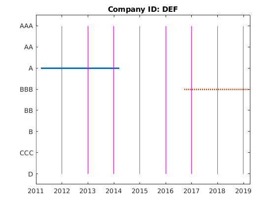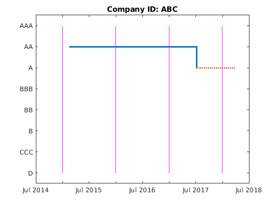 transprob функция изучает, что этот формат данных панели указывает на даты, когда новая оценка присвоена данной компании. transprob принимает, что такие оценки остаются неизменными, если последующая строка явным образом не указывает на изменение оценки. Например, для компании 'ABC', transprob изучает что 'A' оценка неизменна для любой даты после '6-Jul-2017' (неопределенно).
