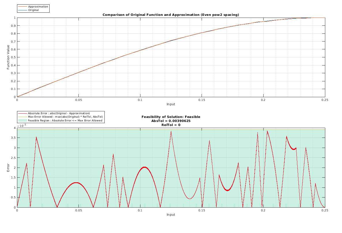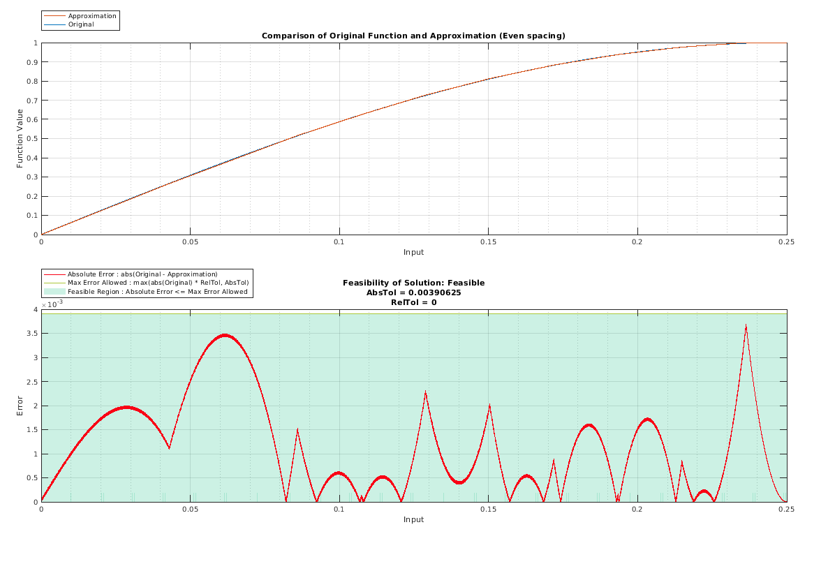 %The software returns several implementations that meet the requirements %specified in the |FunctionApproximation.Problem| and %|FunctionApproximation.Options| objects. You can explore these different %implementations. feasibleSolutions = solution.FeasibleSolutions; tableDataVec = [feasibleSolutions.TableData]; evenSpacingSolutions = find([tableDataVec.IsEvenSpacing]); unevenSpacingSolutions = find(~[tableDataVec.IsEvenSpacing]); evenSolutionsMemoryUsage = arrayfun(@(x) x.totalMemoryUsage(), feasibleSolutions(evenSpacingSolutions)); unevenSolutionsMemoryUsage = arrayfun(@(x) x.totalMemoryUsage(), feasibleSolutions(unevenSpacingSolutions)); bestEvenSpacingSolution = feasibleSolutions(evenSpacingSolutions(evenSolutionsMemoryUsage == min(evenSolutionsMemoryUsage))); bestUnevenSpacingSolution = feasibleSolutions(unevenSpacingSolutions(unevenSolutionsMemoryUsage == min(unevenSolutionsMemoryUsage))); xeven = bestEvenSpacingSolution.TableData.BreakpointValues{1}; yeven = bestEvenSpacingSolution.TableData.TableValues; xuneven = bestUnevenSpacingSolution.TableData.BreakpointValues{1}; yuneven = bestUnevenSpacingSolution.TableData.TableValues; xpow2 = bestEvenPow2SpacingSolution.TableData.BreakpointValues{1}; ypow2 = bestEvenPow2SpacingSolution.TableData.TableValues;