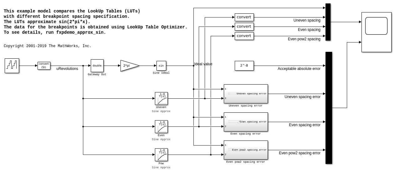 modelName = 'fxpdemo_approx'; open_system(modelName) modelWorkspace = get_param(modelName, 'ModelWorkspace'); modelWorkspace.assignin('xevenFirstPoint' , xeven(1) ); modelWorkspace.assignin('xevenSpacing' , diff(xeven(1:2)) ); modelWorkspace.assignin('yeven' , yeven ); modelWorkspace.assignin('TableDTeven' , bestEvenSpacingSolution.TableData.TableDataType ); modelWorkspace.assignin('BreakpointDTeven' , bestEvenSpacingSolution.TableData.BreakpointDataTypes); modelWorkspace.assignin('xuneven' , xuneven); modelWorkspace.assignin('yuneven' , yuneven); modelWorkspace.assignin('TableDTuneven' , bestUnevenSpacingSolution.TableData.TableDataType ); modelWorkspace.assignin('BreakpointDTuneven' , bestUnevenSpacingSolution.TableData.BreakpointDataTypes); modelWorkspace.assignin('xpow2FirstPoint' , xpow2(1) ); modelWorkspace.assignin('xpow2Spacing' , diff(xpow2(1:2)) ); modelWorkspace.assignin('ypow2' , ypow2 ); modelWorkspace.assignin('TableDTpow2' , bestEvenPow2SpacingSolution.TableData.TableDataType ); modelWorkspace.assignin('BreakpointDTpow2' , bestEvenPow2SpacingSolution.TableData.BreakpointDataTypes); set_param(modelName, 'Dirty', 'off');