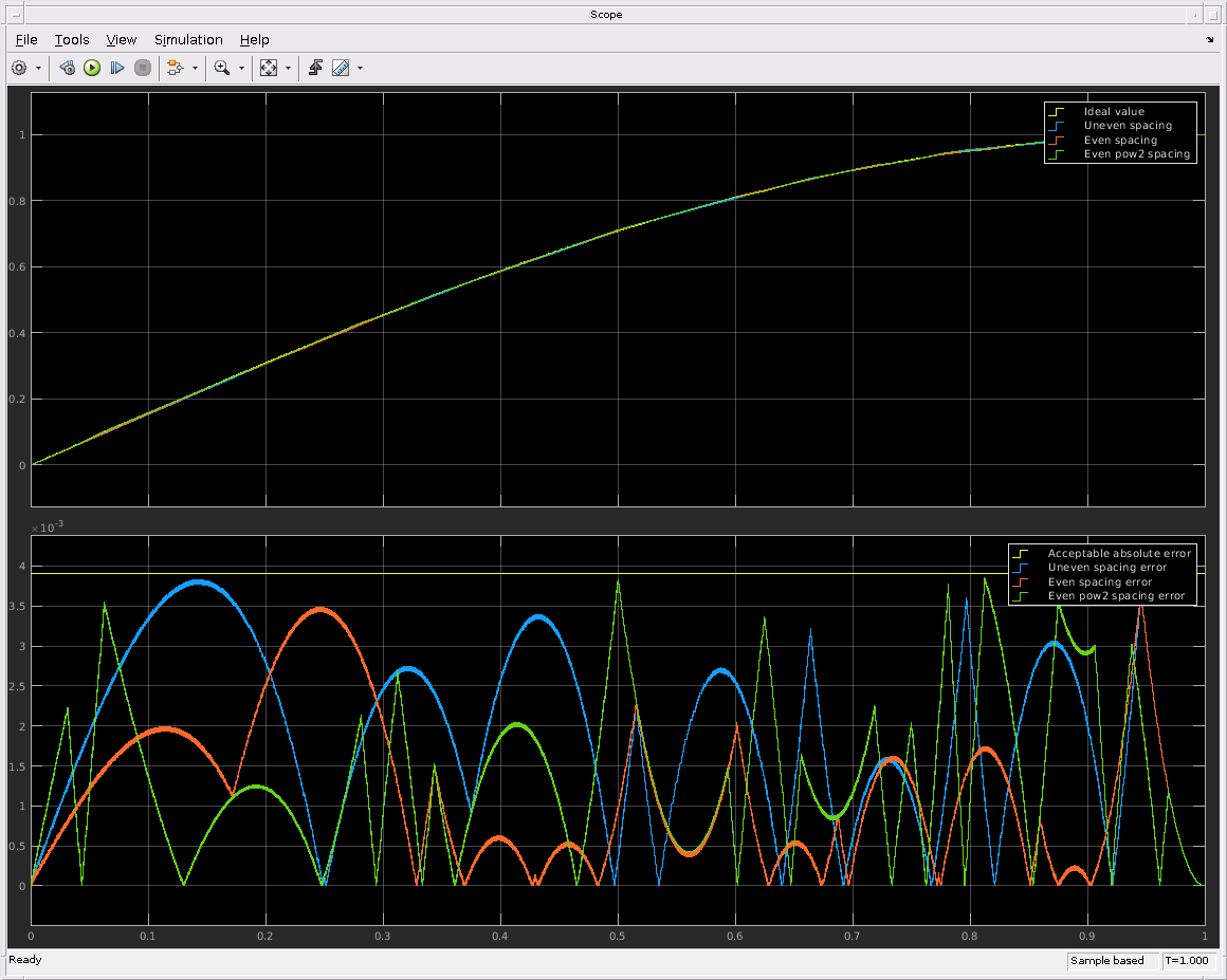 Существует много наборов точек данных интерполяционной таблицы, которые удовлетворили бы этой цели. Различные реализации могут быть выбраны в зависимости от целей, таких как использование памяти и скорость расчета. Этот пример находит решение, которое удовлетворяет этой цели точности с минимальным количеством точек данных.