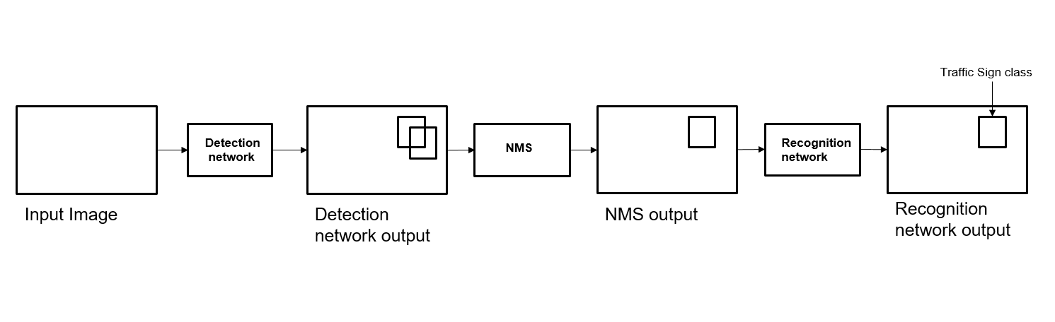 В этом примере обнаружения и распознавания дорожного знака вы выполняете три шага - обнаружение, Немаксимальное подавление (NMS) и распознавание. Во-первых, пример обнаруживает дорожные знаки на входном изображении при помощи сети обнаружения объектов, которая является вариантом сети You Only Look Once (YOLO). Затем перекрывающиеся обнаружения подавлены при помощи алгоритма NMS. Наконец, сеть распознавания классифицирует обнаруженные дорожные знаки.
