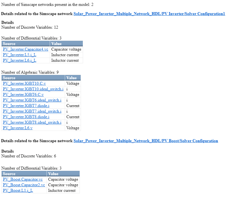 HDL Workflow Advisor Simscape перечисляет количество сетей, существующих в модели и количестве алгебраических и дифференциальных переменных для каждой сети. Советник использует блок Solver Configuration, чтобы идентифицировать каждую уникальную сеть в вашей модели.