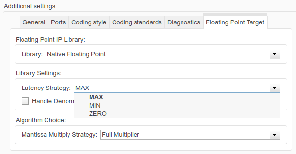 На вкладке HDL Code Generation> Global Settings> Floating Point Target, для Библиотеки, выбирают Native Floating Point, и затем для Стратегии Задержки, выбирают MAX, MIN или ZERO.