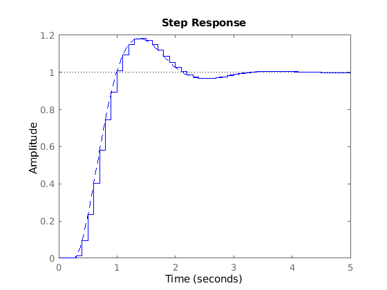 В этом примере, дискретизированной модели hd имеет задержку трех периодов выборки. Алгоритм дискретизации поглощает остаточную задержку полупериода в коэффициенты hd.