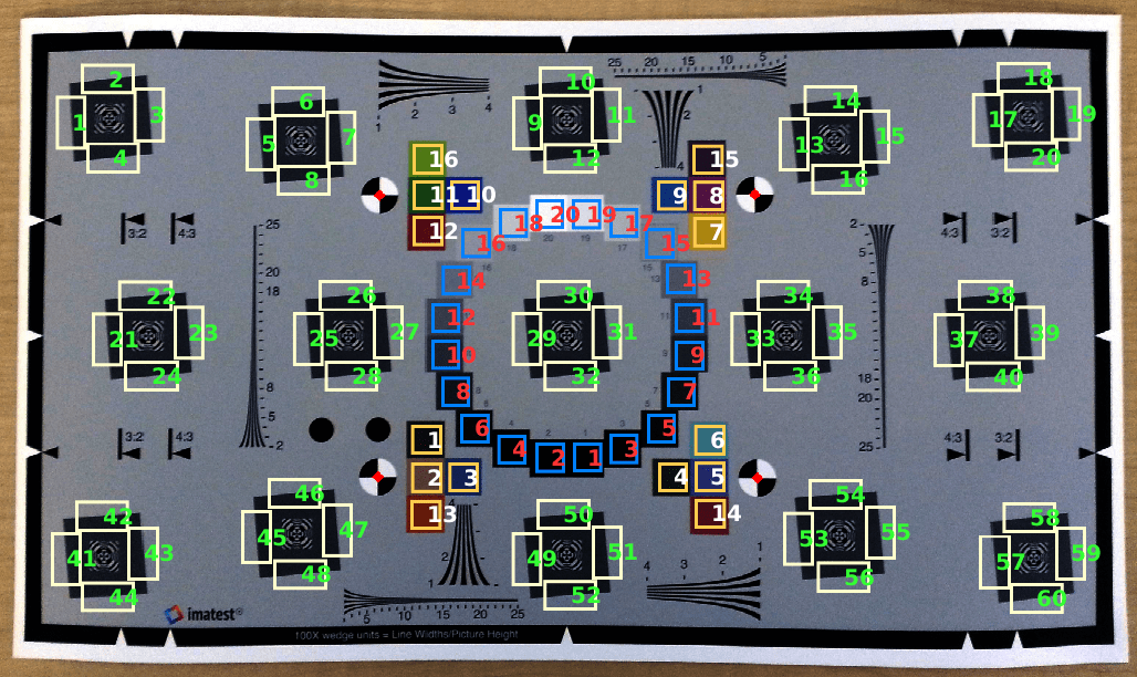 esfrChart поддержка объектов Расширенные и Расширенные версии eSFR тестирует график. Эти тестовые графики основаны на тестовом графике стандарта ISO 12233:2014, и у них есть дополнительные визуальные функции, такие как цветные ROI и дополнительные наклонные ROI ребра. esfrChart объект также принимает версии Расширенных и Расширенных тестовых графиков eSFR с дополнительными фоновыми клиньями.