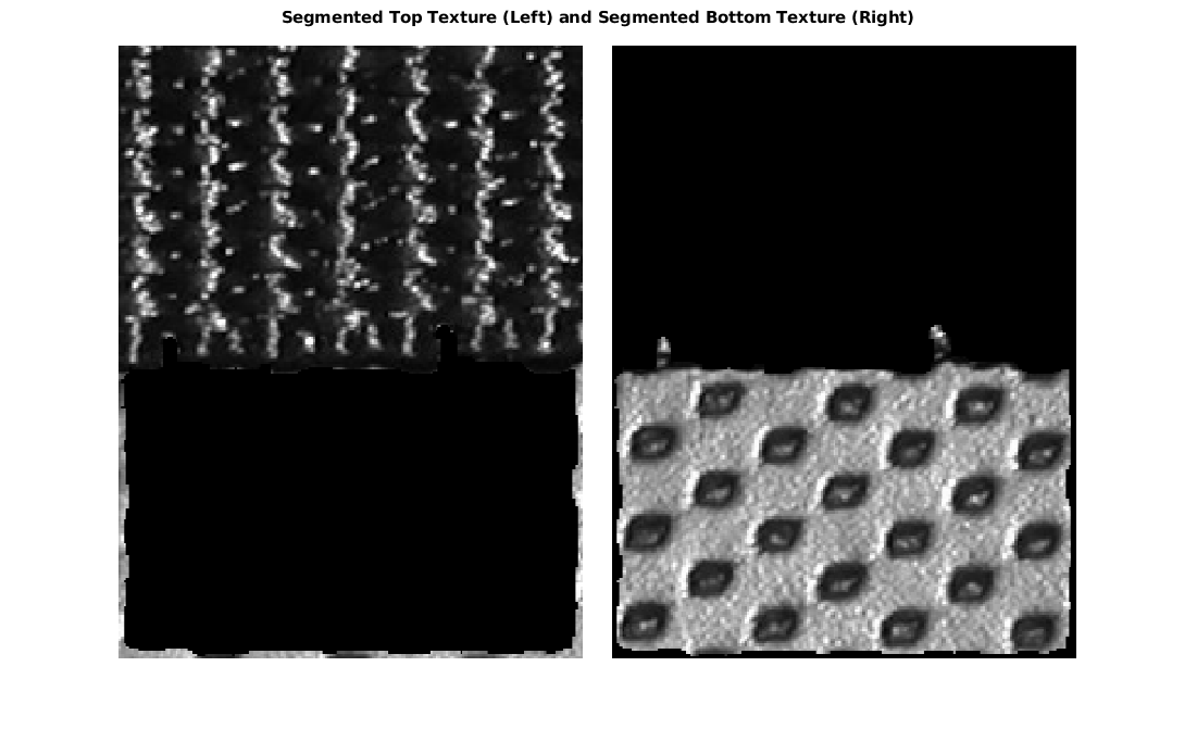 title('Segmented Top Texture (Left) and Segmented Bottom Texture (Right)')