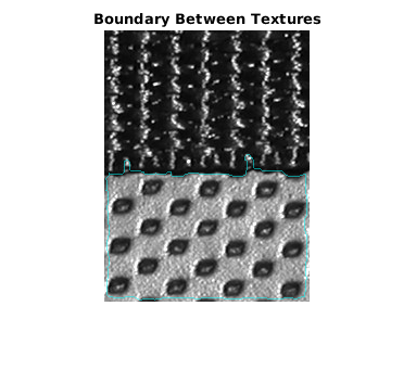 boundary = bwperim(mask); imshow(labeloverlay(I,boundary,"Colormap",[0 1 1])) title('Boundary Between Textures')