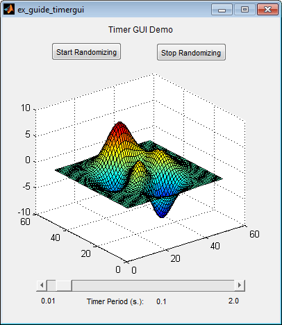В этом примере показано, как исследовать и запустить предварительно созданное приложение GUIDE. Отображения приложения объемная поверхностная диаграмма, добавляет случайный шум в поверхность и обновляет график равномерно. Приложение содержит две кнопки: тот, который начинает добавлять случайный шум в график и другой, который прекращает добавлять шум. Ползунок ниже графика позволяет пользователю устанавливать период обновления между 0,01 и 2 секундами.