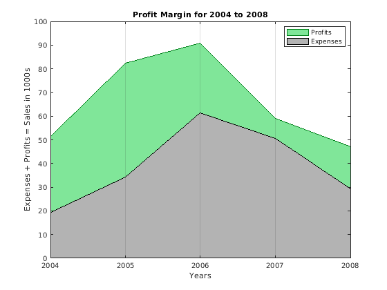 title('Profit Margin for 2004 to 2008') xlabel('Years') ylabel('Expenses + Profits = Sales in 1000s') legend('Profits','Expenses')