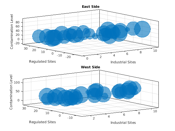 tiledlayout(2,1,'TileSpacing','compact') ax1 = nexttile; % East side bubblechart3(ax1,nsites1,nregulated1,levels1,towns1); title('East Side') xlabel('Industrial Sites') ylabel('Regulated Sites') zlabel('Contamination Level') % West side ax2 = nexttile; bubblechart3(ax2,nsites2,nregulated2,levels2,towns2); title('West Side') xlabel('Industrial Sites') ylabel('Regulated Sites') zlabel('Contamination Level')