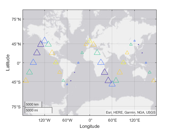 geoscatter( использование lat,lon,A)A определять площадь каждого маркера (в points^2). Чтобы чертить все маркеры с тем же размером, задайте A как скаляр. Чтобы чертить маркеры с различными размерами, задайте A как вектор та же длина как lat и lon. Если вы не задаете A, geoscatter использует размер по умолчанию.