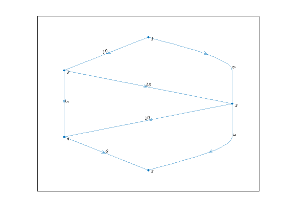 Найдите максимальное значение потока между узлом 1 и узлом 5. Задайте 'augmentpath' использовать алгоритм Форда-Фалкерсона и использовать два выходных параметров, чтобы возвратить график ненулевых потоков.