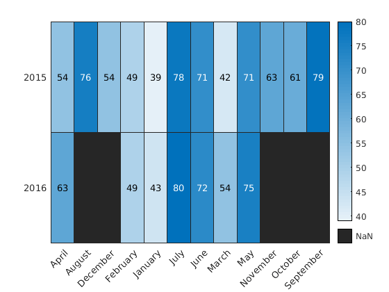 Преобразуйте категориальный months и years массивы в числовые индексы, чтобы использовать с accumarray функция. Вычислите цветные данные как максимальную температуру для каждой комбинации месяца и года с помощью accumarray функция. Используйте NaN для недостающих комбинаций месяца и года.