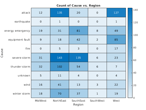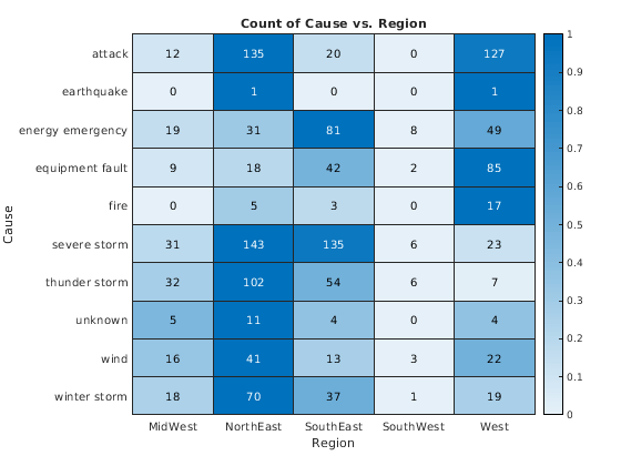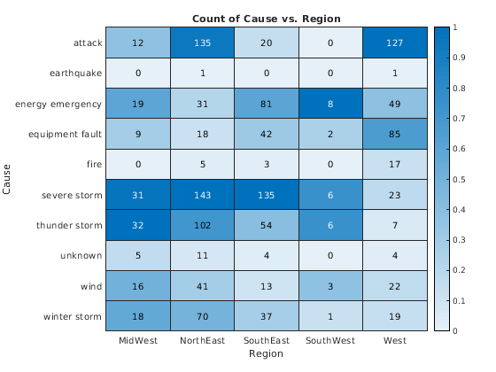 Нормируйте цвета вдоль каждого столбца. Наименьшее значение в каждых картах столбца к первому раскрашивает палитру и самые большие карты ценности к последнему цвету. Последний цвет указывает на причину, которая вызвала большинство отключений электроэнергии для каждой области.