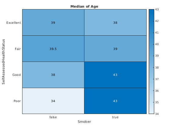 h = heatmap(tbl,'Smoker','SelfAssessedHealthStatus','ColorVariable','Age','ColorMethod','median');