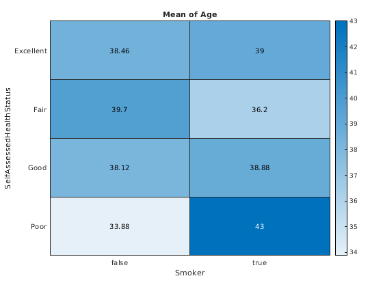 Загрузите patients набор данных и создает тепловую карту из данных. Окрасьте каждую ячейку с помощью среднего возраста пациентов с конкретной парой Smoker и SelfAssessedHealthStatus значения путем установки ColorVariable опция к 'Age'.