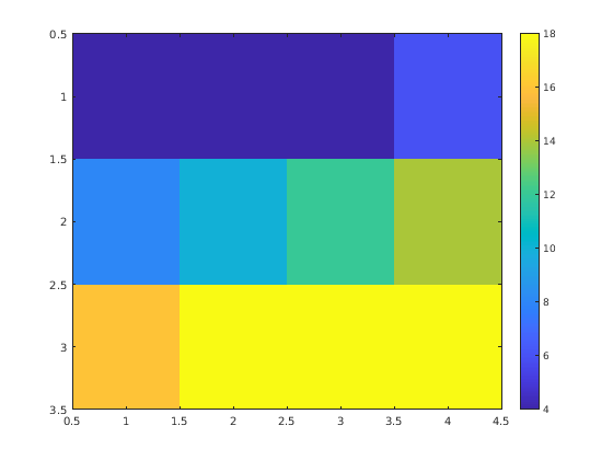imagesc( задает расположение изображения. Используйте x,y,C)x и y задавать местоположения углов, соответствующих C(1,1) и C(m,n). Чтобы задать оба угла, установите x и y как двухэлементные векторы. Задавать первый угол и позволять imagesc определите другой, установите x и y как скалярные значения. Изображение расширено и ориентировано как применимое.