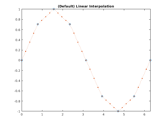 figure vq1 = interp1(x,v,xq); plot(x,v,'o',xq,vq1,':.'); xlim([0 2*pi]); title('(Default) Linear Interpolation');