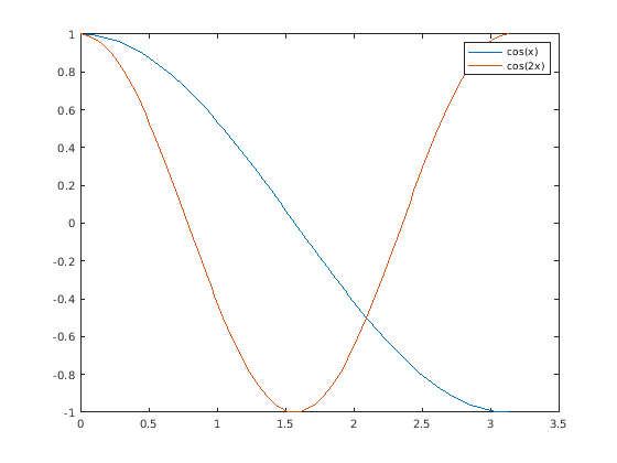 legend({'cos(x)','cos(2x)'},'Location','southwest')