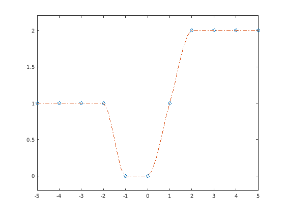 • spline построения S(x) почти тем же способом pchip построения P(x). Однако spline выбирает наклоны в xj по-другому, а именно, чтобы сделать даже S(x) непрерывный. Это различие оказывает несколько влияний: