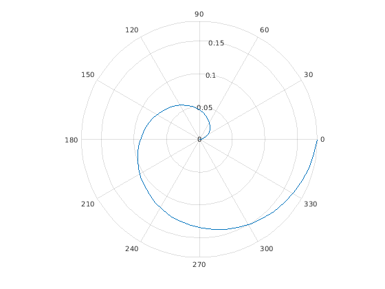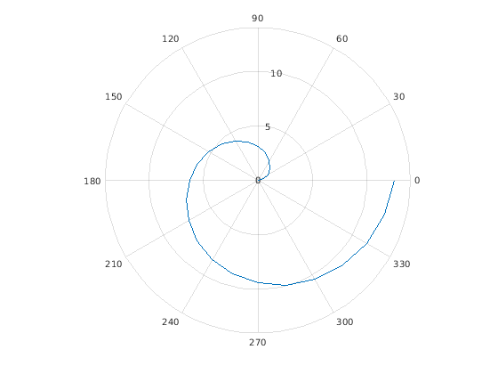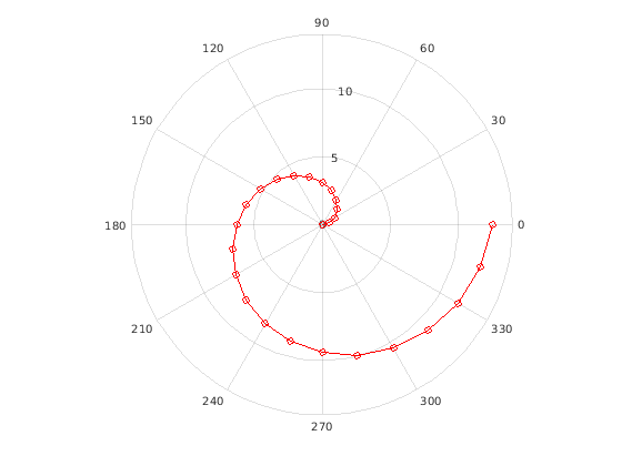 polarplot(theta,rho) строит график в полярных координатах, с theta указание на угол в радианах и rho указание на значение радиуса для каждой точки. Входные параметры должны быть векторами с равной длиной или матрицами с равным размером. Если входные параметры являются матрицами, то polarplot столбцы графиков rho по сравнению со столбцами theta. В качестве альтернативы одни из входных параметров могут быть вектором и другим матрица, пока вектор является той же длиной как одна размерность матрицы.